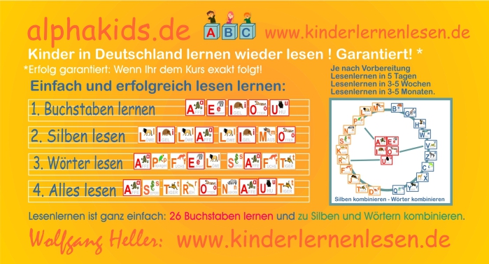 Hier auf dieser WebSite möchte ich euch zeigen, dass Lesenlernen ganz einfach ist und ganz wenig Material verlangt. Ich möchte euch auch zeigen, dass es realsitisch ist, in 1, 2 oder 3 Monaten lesen zu lernen. Ich habe es mit Schulklassen und Vorschulkursen praktiziert. Ich weiß, dass es geht, ich weiß, wie es geht.