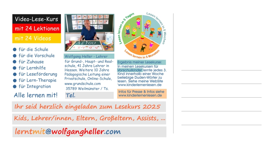 Mit dem Lesekurs, seinen 24 Lektionen und 24 Videos lernen wir schließlich jedes beliebige Wort zu lesen. Das alles schaffen wir unter normalen Umständen in einem Vierteljahr. Ich bereiute